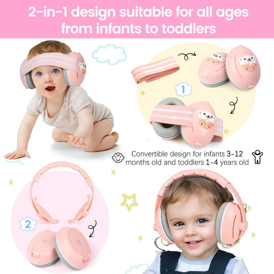 2-in-1 Baby Ear Muffs Noise Protection,Noise Canceling Headphones for kids 0-36 Months, Infant Ear Protection for Plane & Sleep, Adjustable Headband - Pink