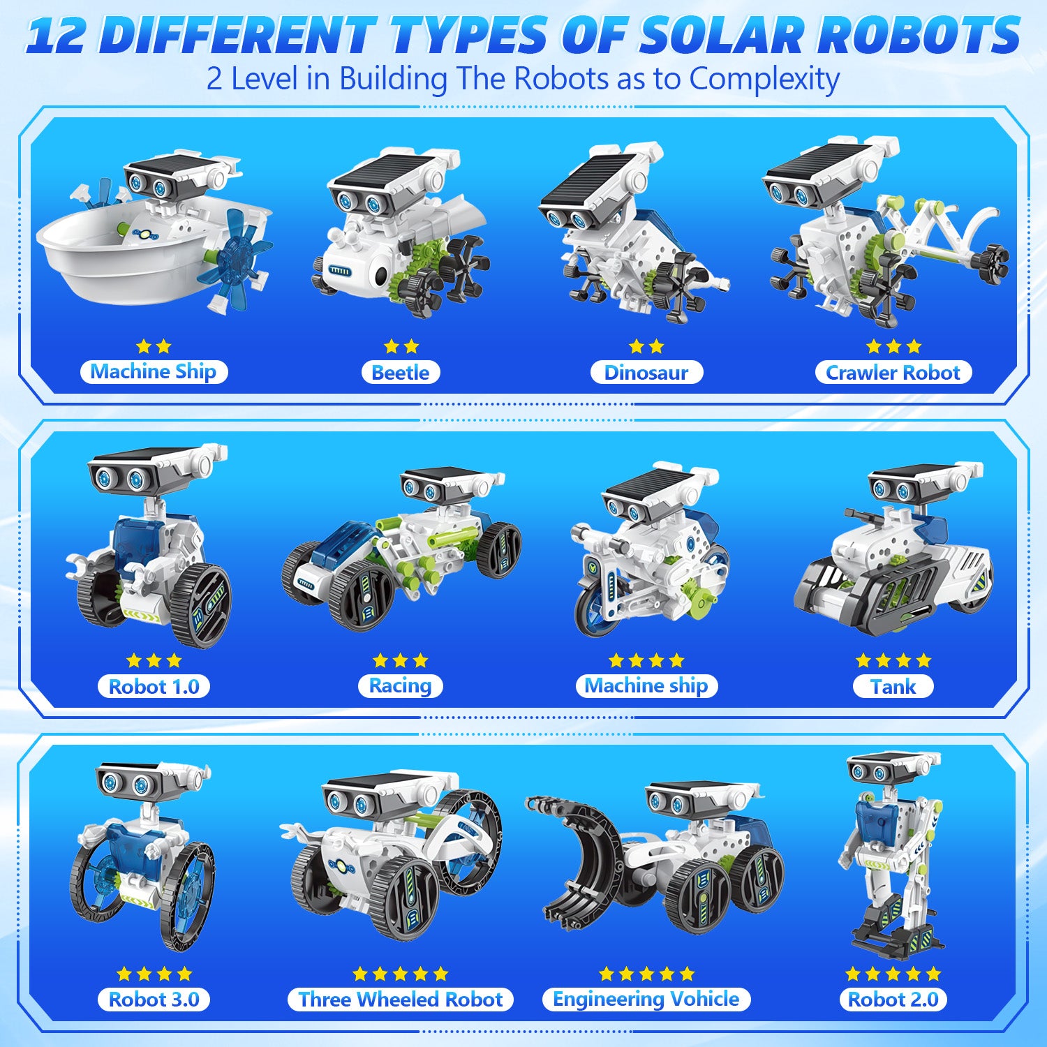 The Kids Robots Kit includes 12 different types of solar robots that can be created using the provided components. Each robot has its own unique features and characteristics. The solar robot kit also offers varying levels of difficulty in building robots, making it perfect for beginners who can start with simpler robots kit before moving on to more challenging ones.
