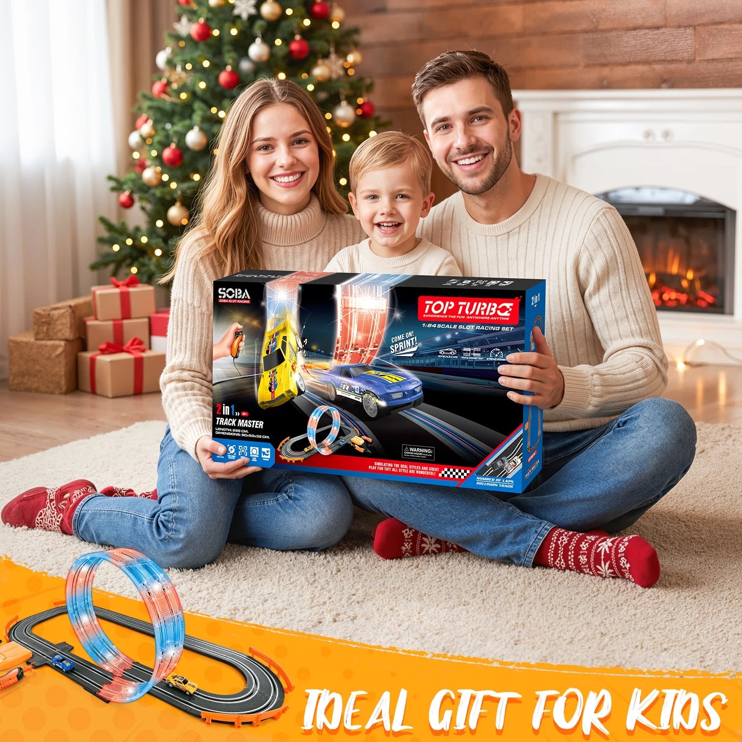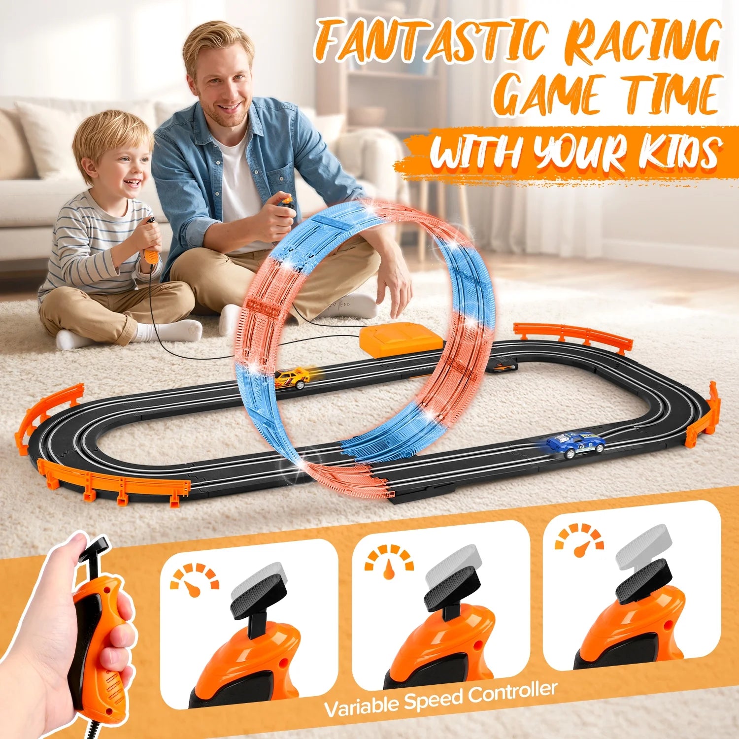 đď¸UQN 2-in-1 9.86ft Electric Slot Car Race Track Set Toy with LED Lights, Two 1:64 Scale Racing Cars, Two Electric Controller, Dual Racing Game, Lap Counter, Circular Overpass Tracks.