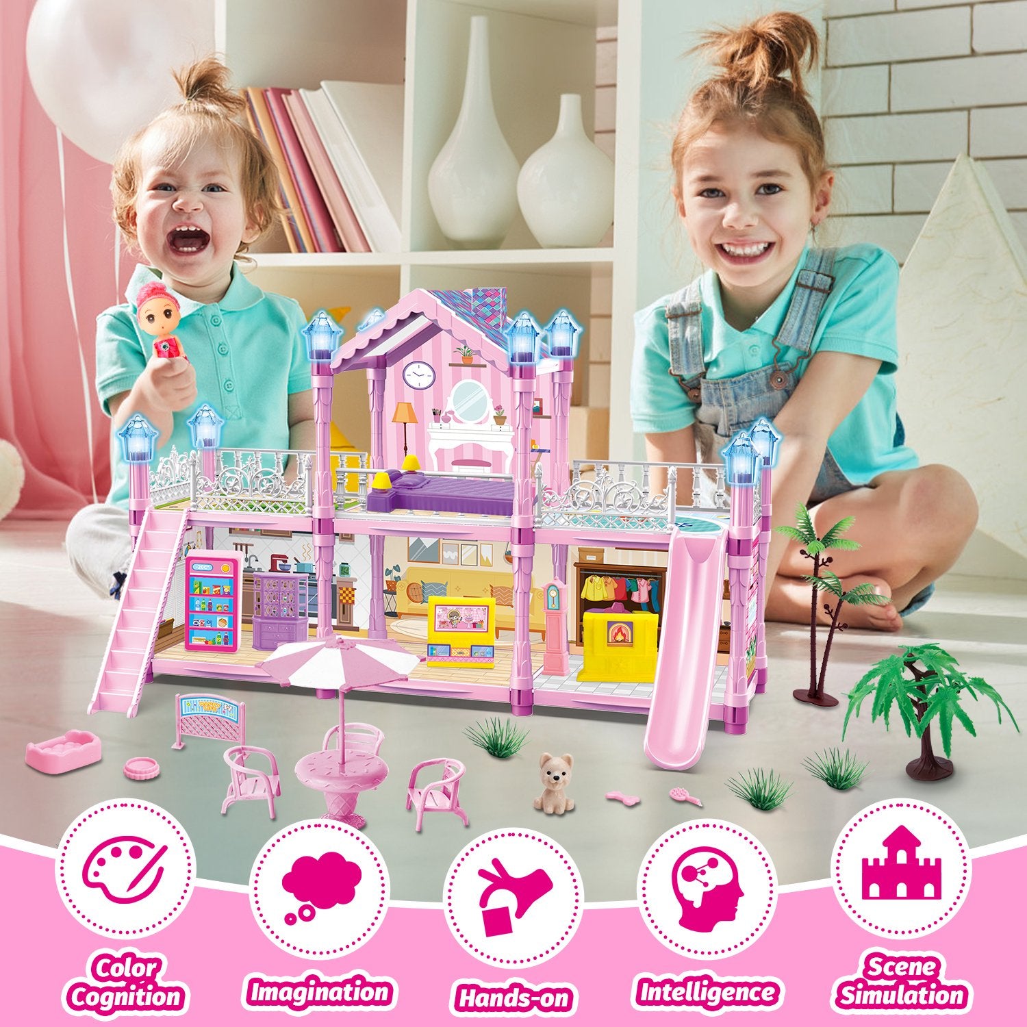 Dollhouse Kit for Girls Ages 3-6, 131PCS Pink DIY Pretend Play Toy House With Slide, Lights, 4 Rooms 2 Balconies Furniture, Birthday Gift for 2 3 4 5 Years Old Girls/Kids/Toddlers.