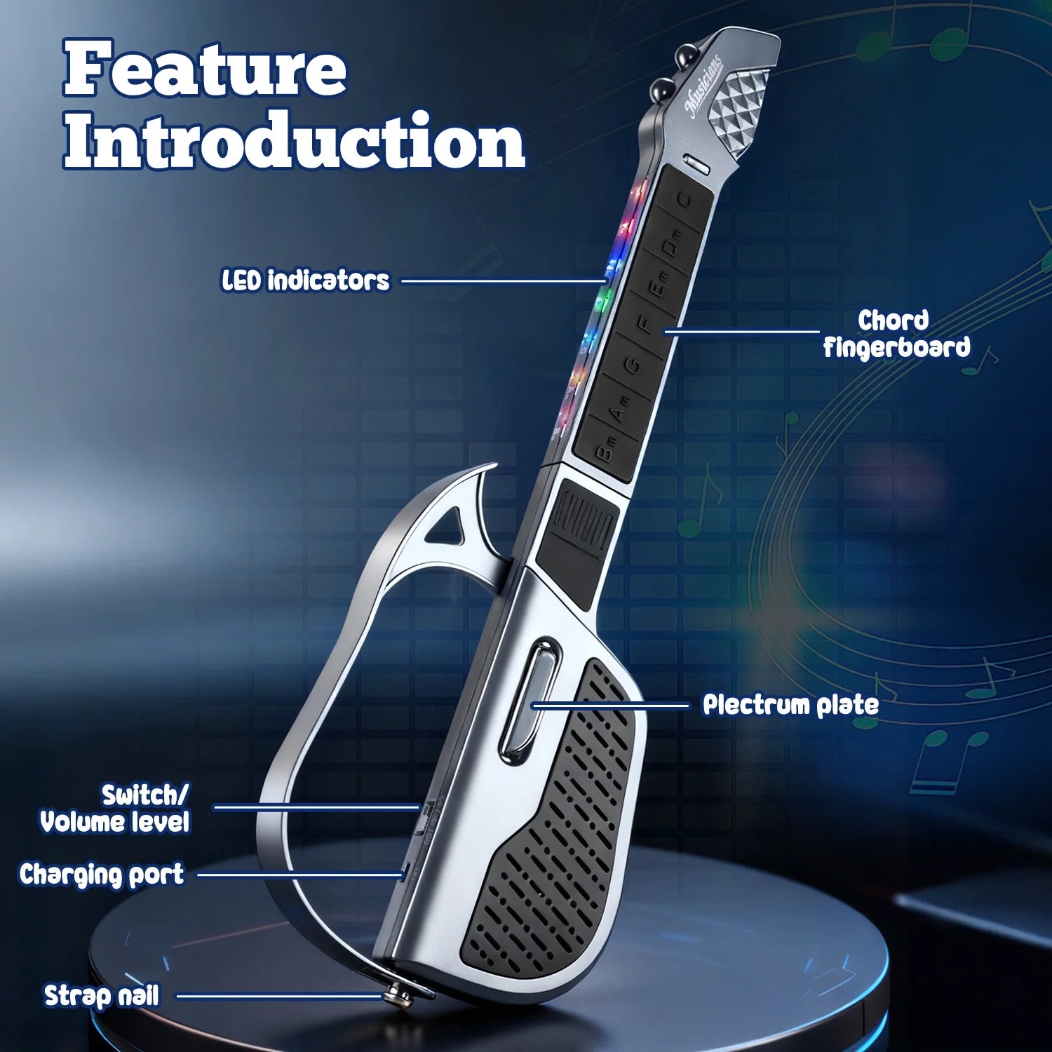 - đčăString-Free & Foldableă: Foldable guitar for kids guitar features 7 chord buttons and a plectrum plate, discarding the complexity of traditional guitar strings and providing a simpler way for young kids to play. When folded, it is compact in size, convenient for storage and carrying, allowing kids to enjoy music wherever they go.