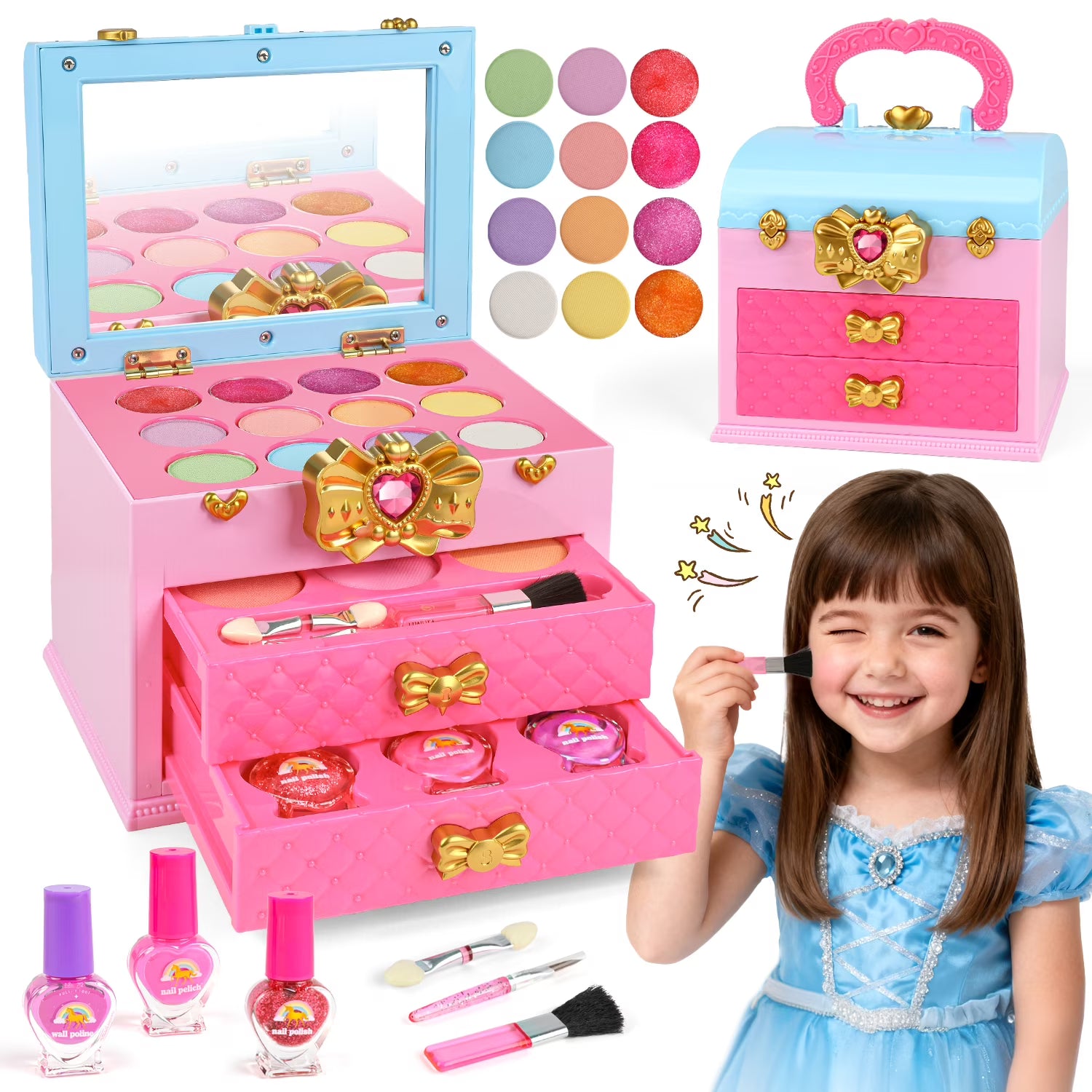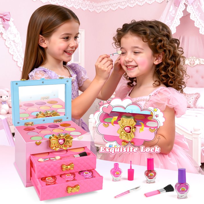- âăConvenient Storageă: The washable makeup kit comes with an elegant pink-and-blue makeup case featuring multiple compartments and a sturdy handle. It neatly organizes all accessories while being easy to carry and store, helping kids develop tidy habits.