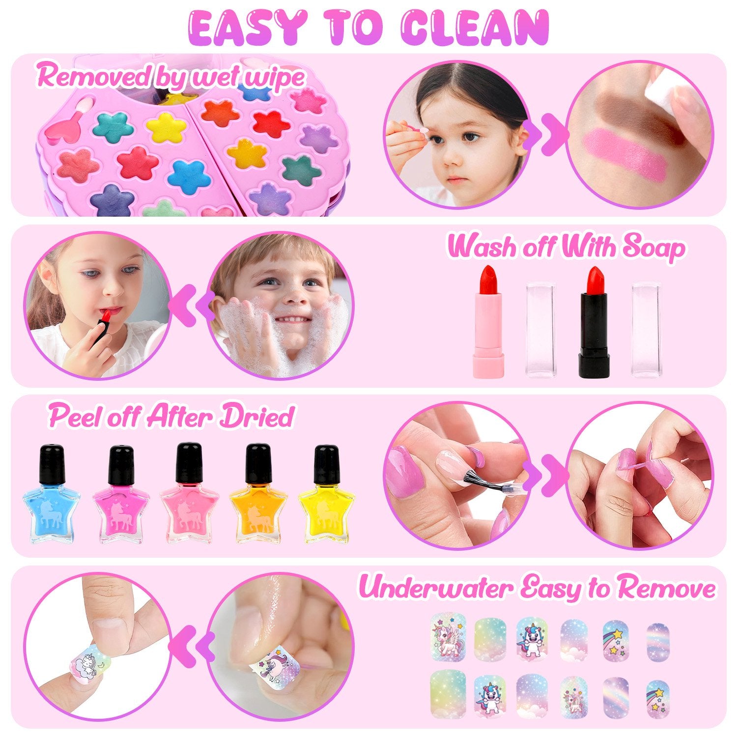 - đ§œăPeel-off Nail Polish & Washable Makeupă: The nail art kit and makeup set for girls features rich, vibrant colors that apply effortlessly and peel off cleanly. The real makeup is easily washable, making cleanup simple and hassle-freeâno residue worries and gentle on kid's delicate skin.
