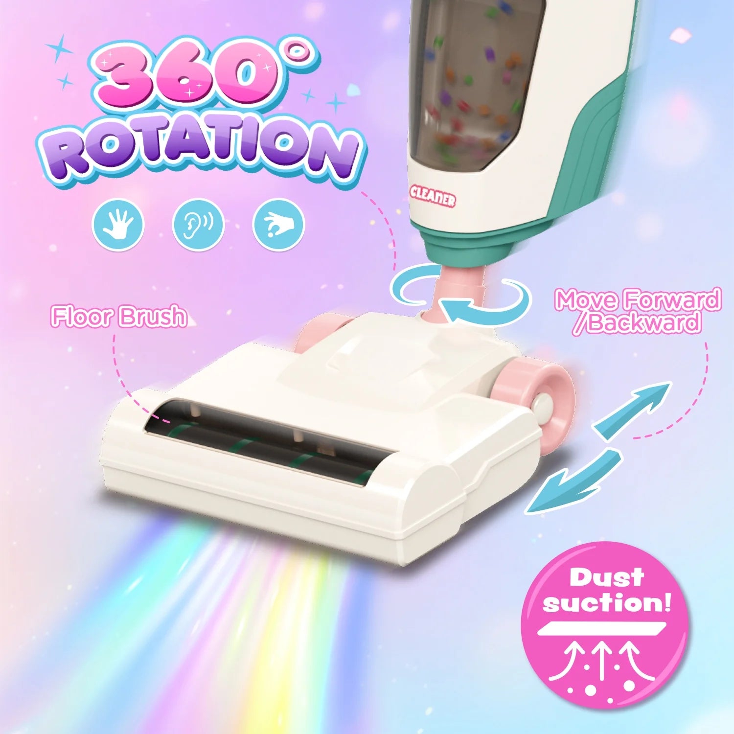 - đ§©ă2-In-1 Pretend Play Setă: The toddler vacuum toy that works can be transformed into two forms, upright and handheld. Children can easily replace them to meet the needs of different cleaning scenarios. For safety reasons, this vacuum cleaner toy has a gentle suction force and is suitable for picking up small pieces of paper and other light debris.