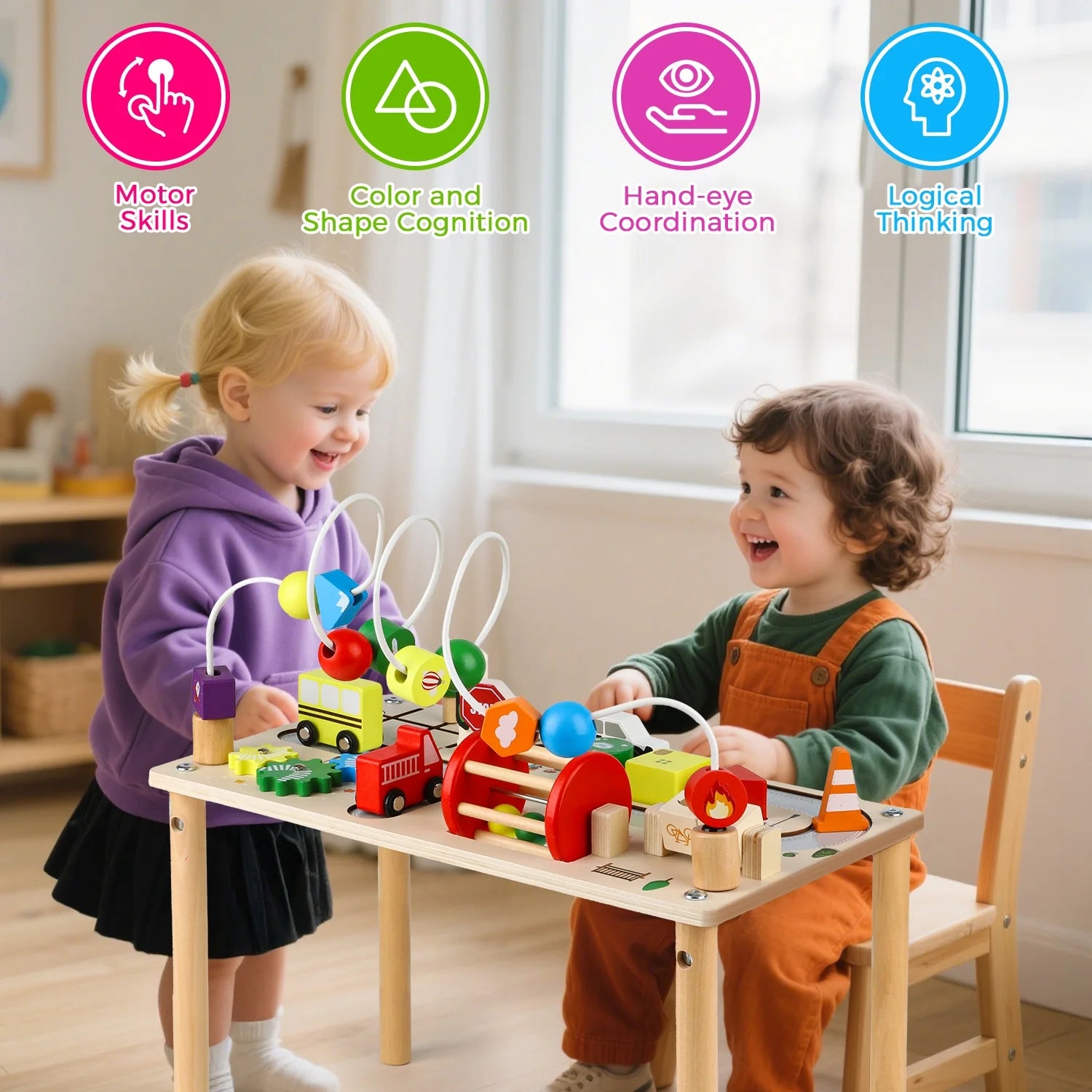 ✅The table features a transportation-themed sensory area with brightly colored carts, simulated roads, vehicle tracks, gears and a bead maze to turn playtime into a fun learning adventure.