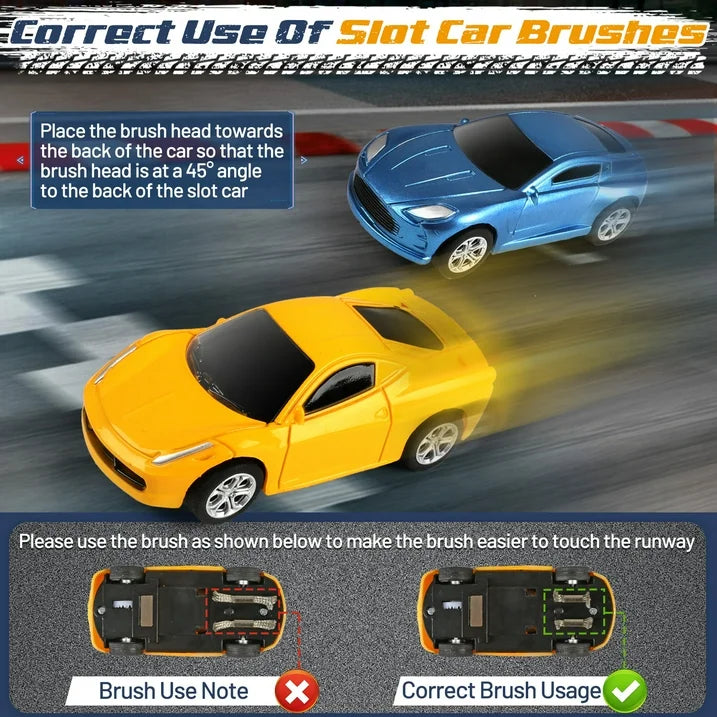 - 🏎️Interactive Play & Great Competition - Fast paced & exciting. Learn to slow down as you go around the corners just like in a regular car. The slot car race is not just a friendship toy, but also a family toy, you can compete with your child, a great alternative to video games.