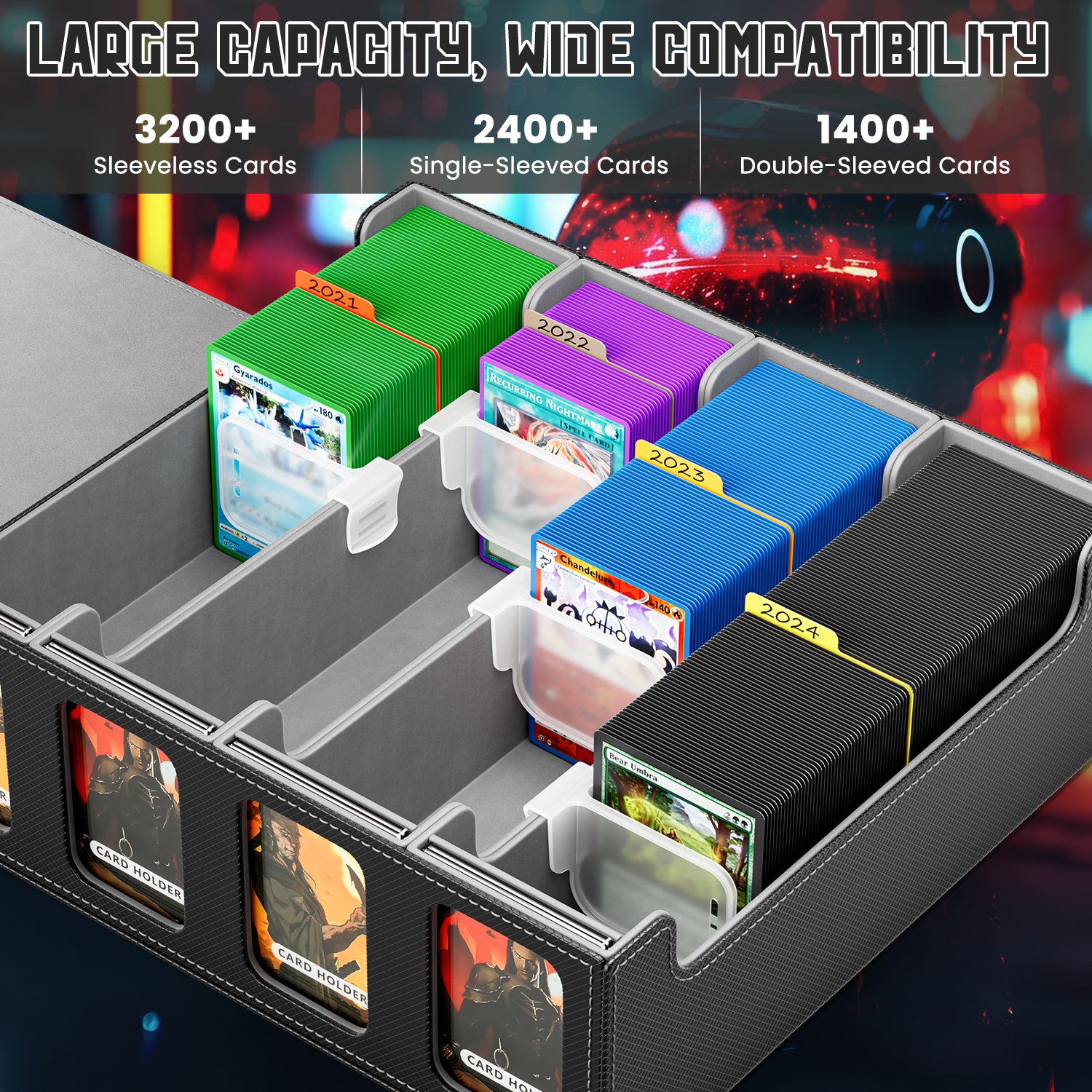 🃏3200+ ULTRA CAPACITY CARD DECK BOX - Compared with most 3-row storage boxes on the market, the capacity of 4-row card deck box is greatly improved. Our trading card storage box comes with 4 rows of storage space for 3200+ sleeveless cards, 1800+ single-sleeved cards or 1500+ double-sleeved cards, greatly improving the needs of card collectors.