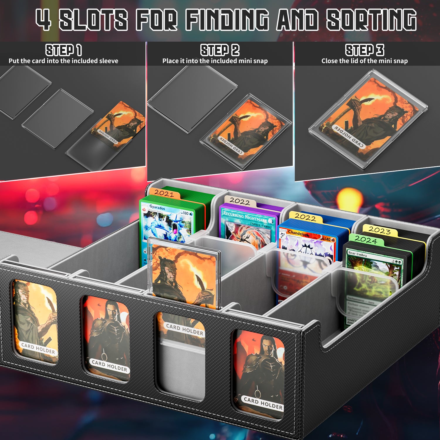 🪟4 DISPLAY SLOTS FOR EASY CARD PREVIEW - This card deck case has 4 display slots on the side for 4 collector cards, each with a carabiner and card holder, making it easy for you to distinguish between the different cases and preview their contents.