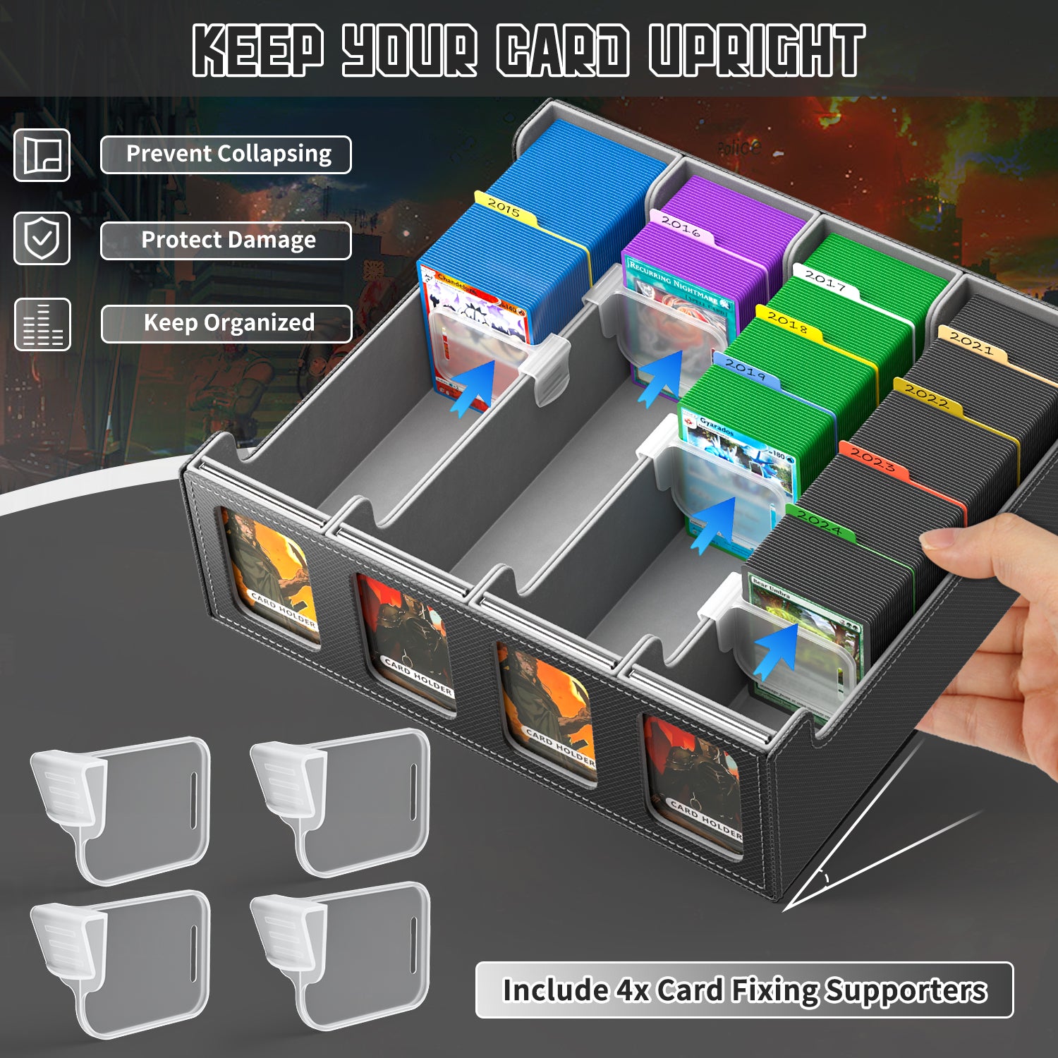 🩶INNOVATIVE CARD SUPPORTS - Designed to prevent your valuable cards from collapsing. Even when the trading card storage box isn't fully packed, these supporters ensure your cards stay upright, avoiding damage and domino-like toppling. This feature not only preserves the condition of your cards but also elevates the collectible value of your growing collection by keeping them in pristine shape.