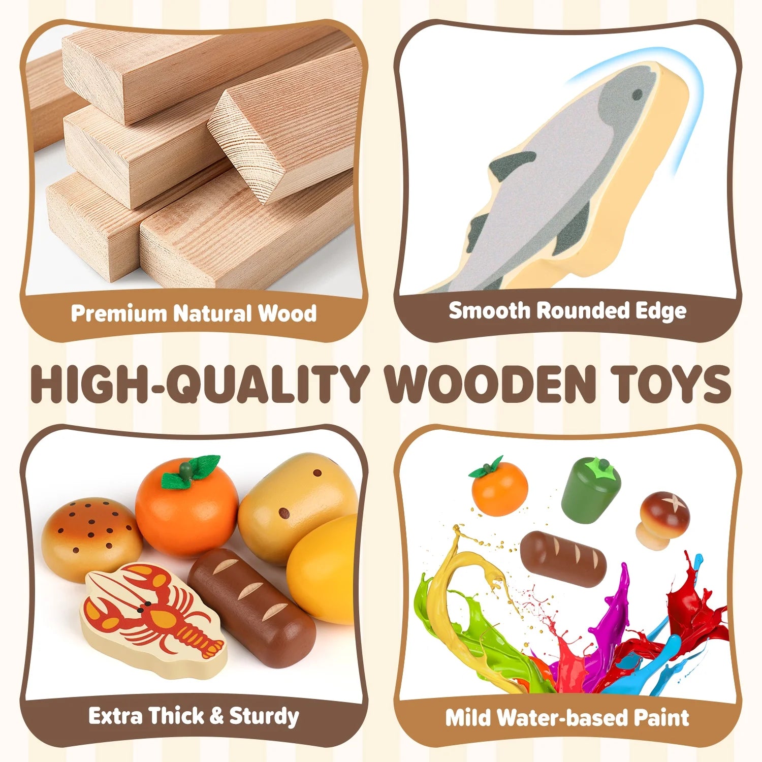 - đŠđŠăSimulation of Wooden Materială: Pretend food toys are made of safe wooden material, delicate and solid texture, smooth edges without burrs, mild water-based paint coloring, both restore the appearance of the ingredients, but also to protect the safety of kids to play.