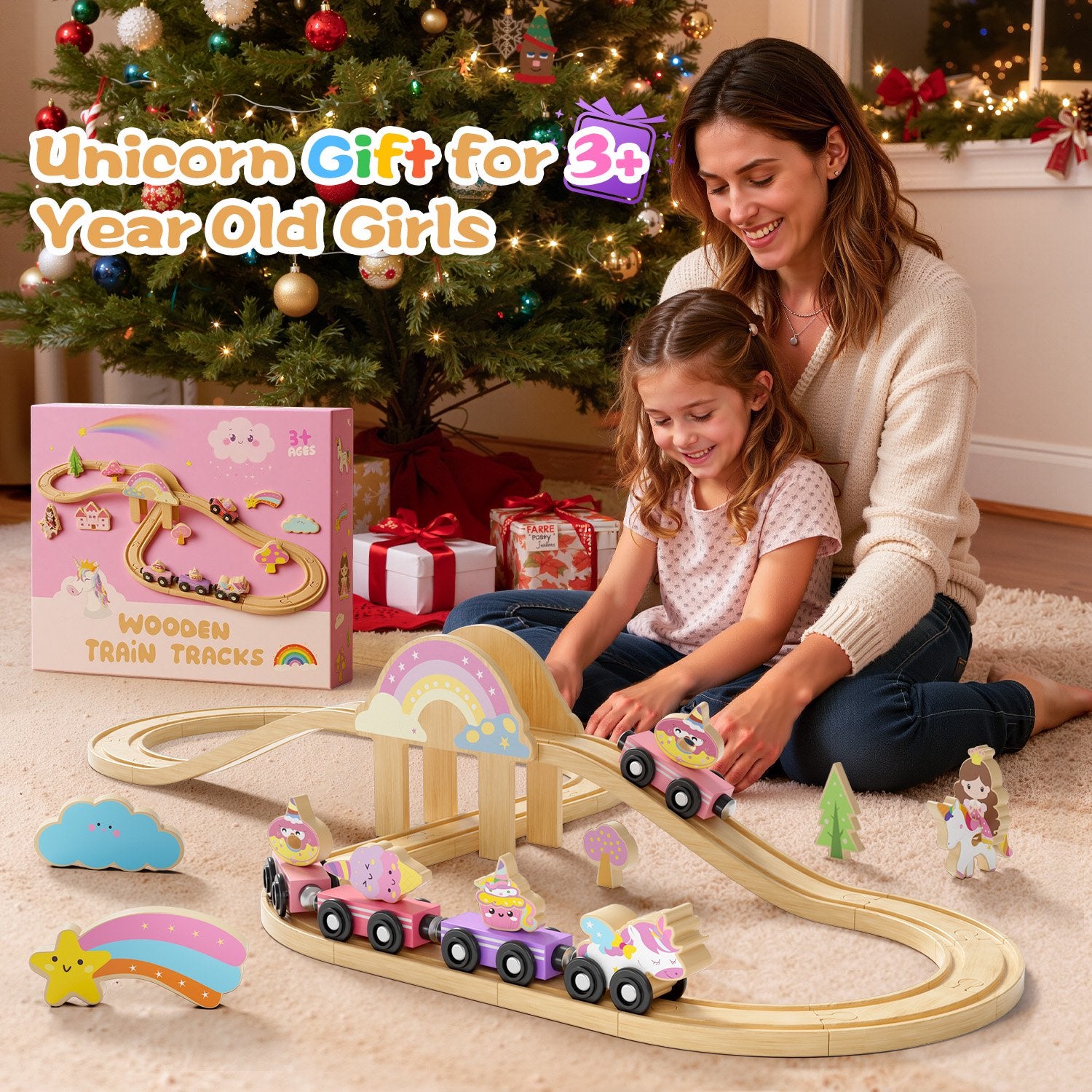Wooden Train Set for Kids, Wooden Train Track for Toddlers 2 3 4 5, Unicorn Train Toy with 4 Magnetic Trains & Accessories, Railway Playset Christmas Birthday Gifts for 3 4 5 6 Year Girls Boys